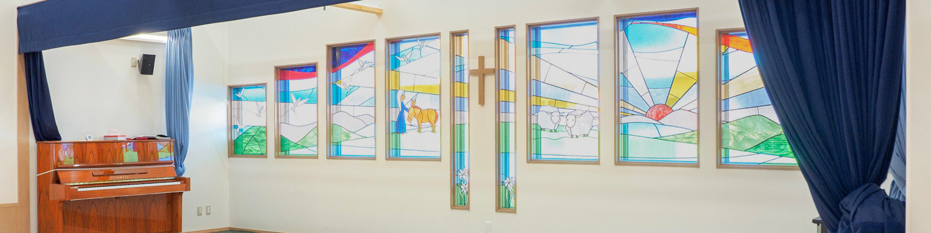 玄関から見て左手奥にあるのがステージ。中央右に見えるドアが保育室(3~5才)入口。